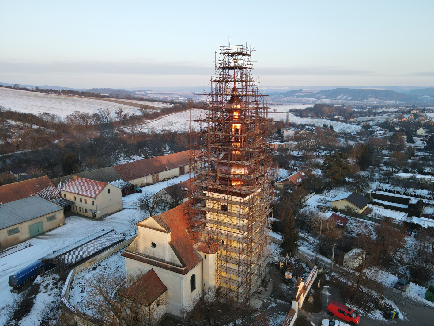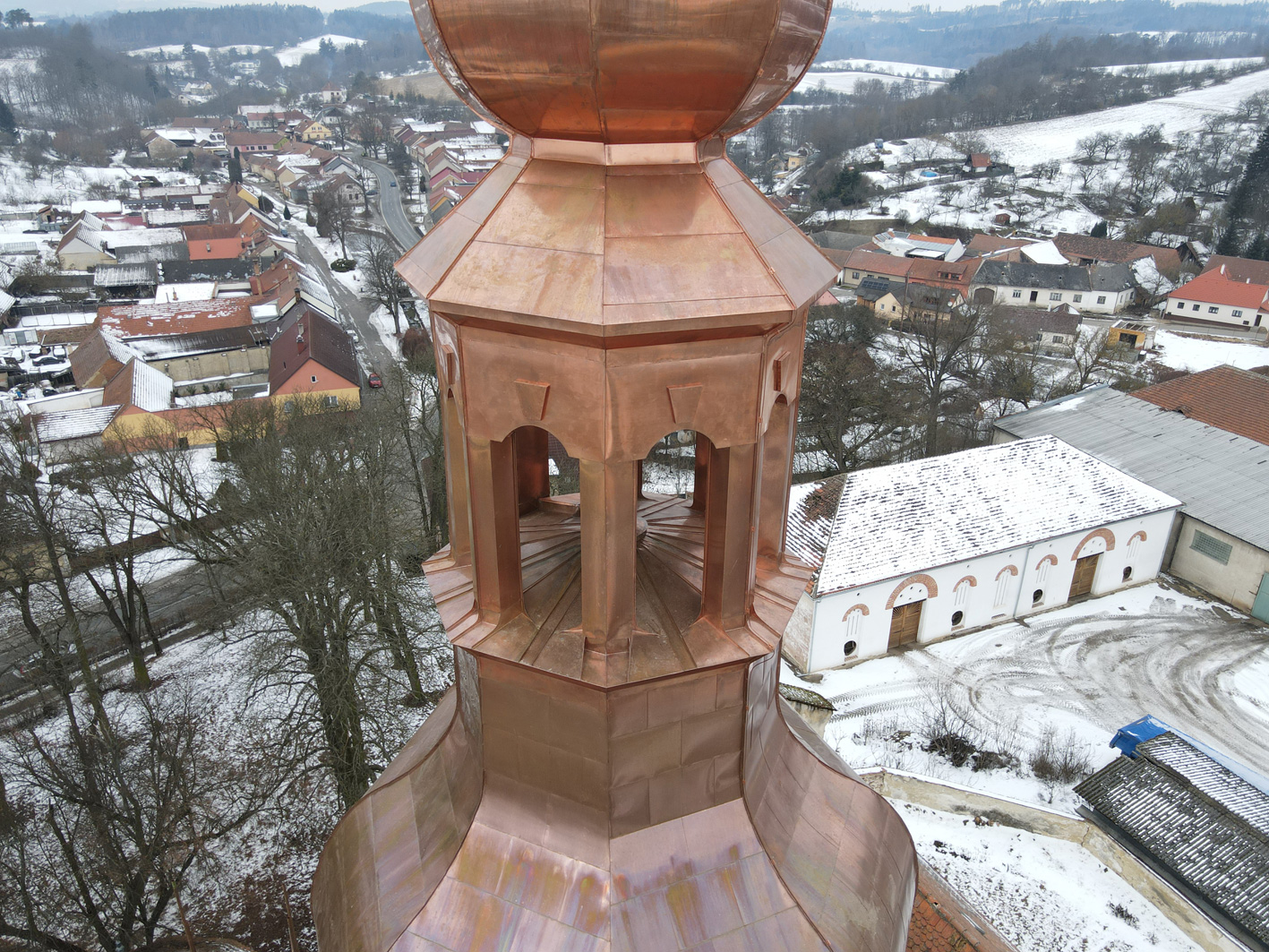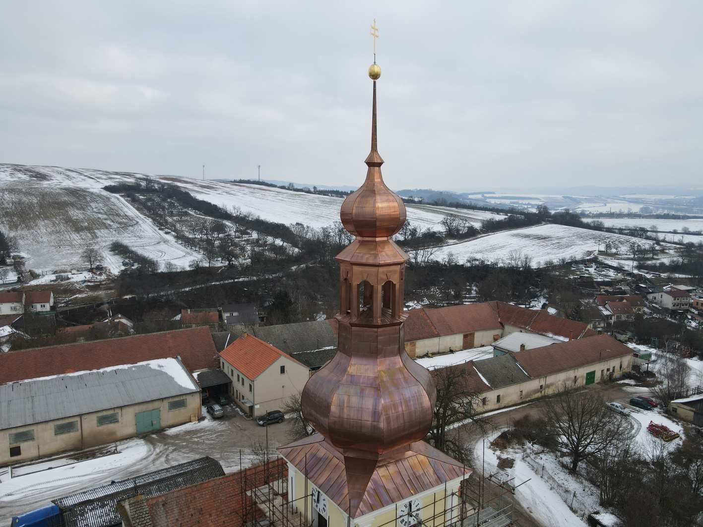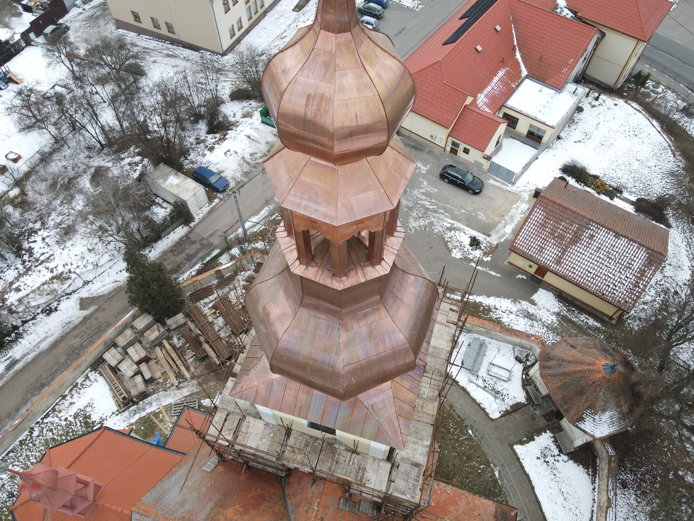 Oprava střechy věže kostela Nanebevzetí Panny Marie v Sebranicích